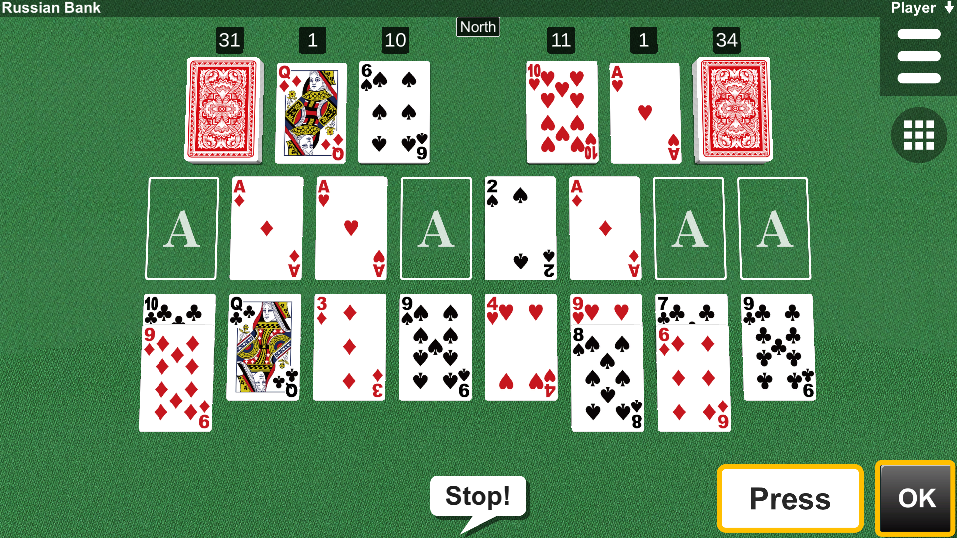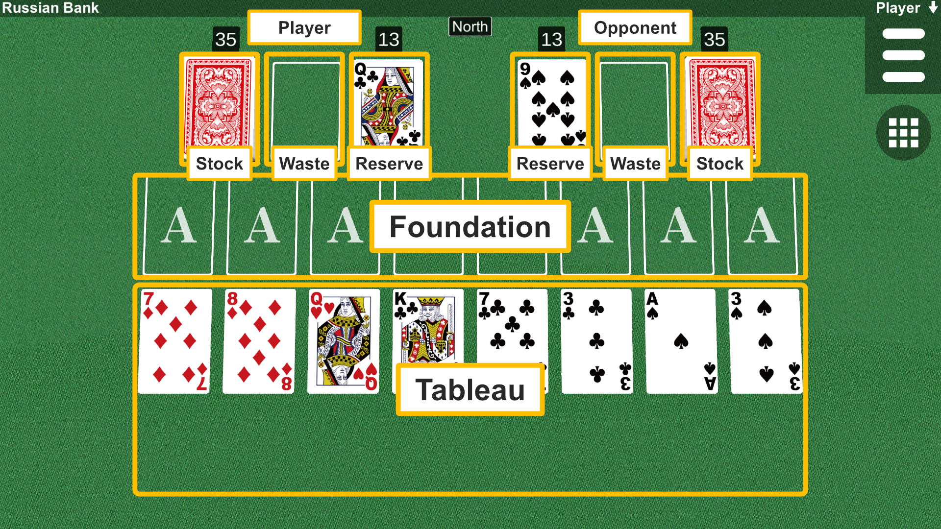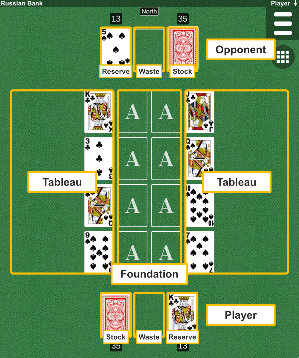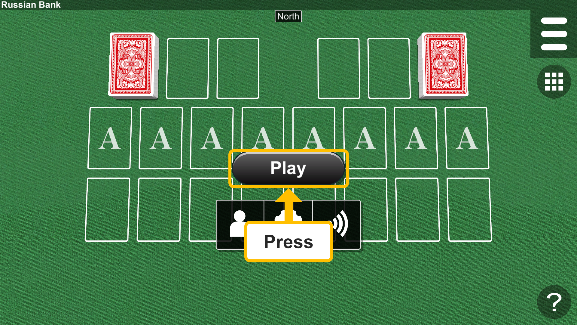 Russian Bank is a competitive solitaire game for two players, also known as Crapette. The objective of the game is to remove all of a player's cards. Press the Play button to start the game (Fig. 1).