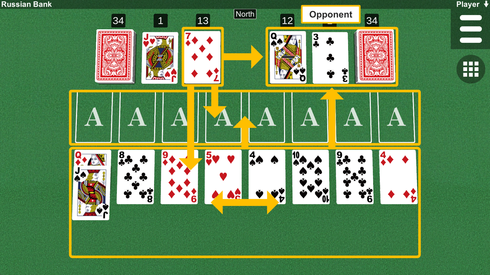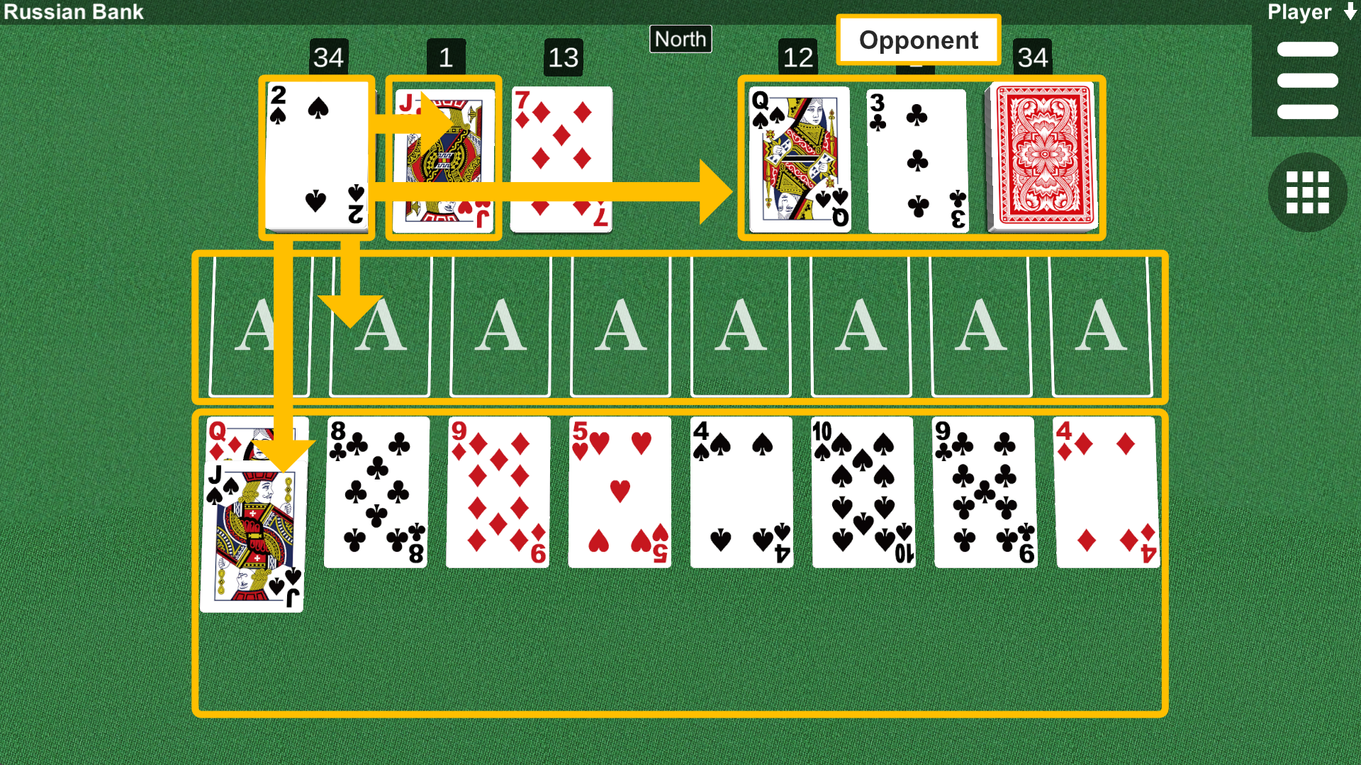 Players can move the top cards of the reserve and tableau onto the foundations, tableau, or the opponent’s cards. The foundations start with an ace and continue with cards of the same suit in ascending rank. A card may be placed on the top card of the tableau if it is one rank lower and of a different color, and any card may be placed in an empty tableau space. Cards can also be moved onto an opponent’s cards if they are one rank higher or lower of the same suit (Fig. 4).