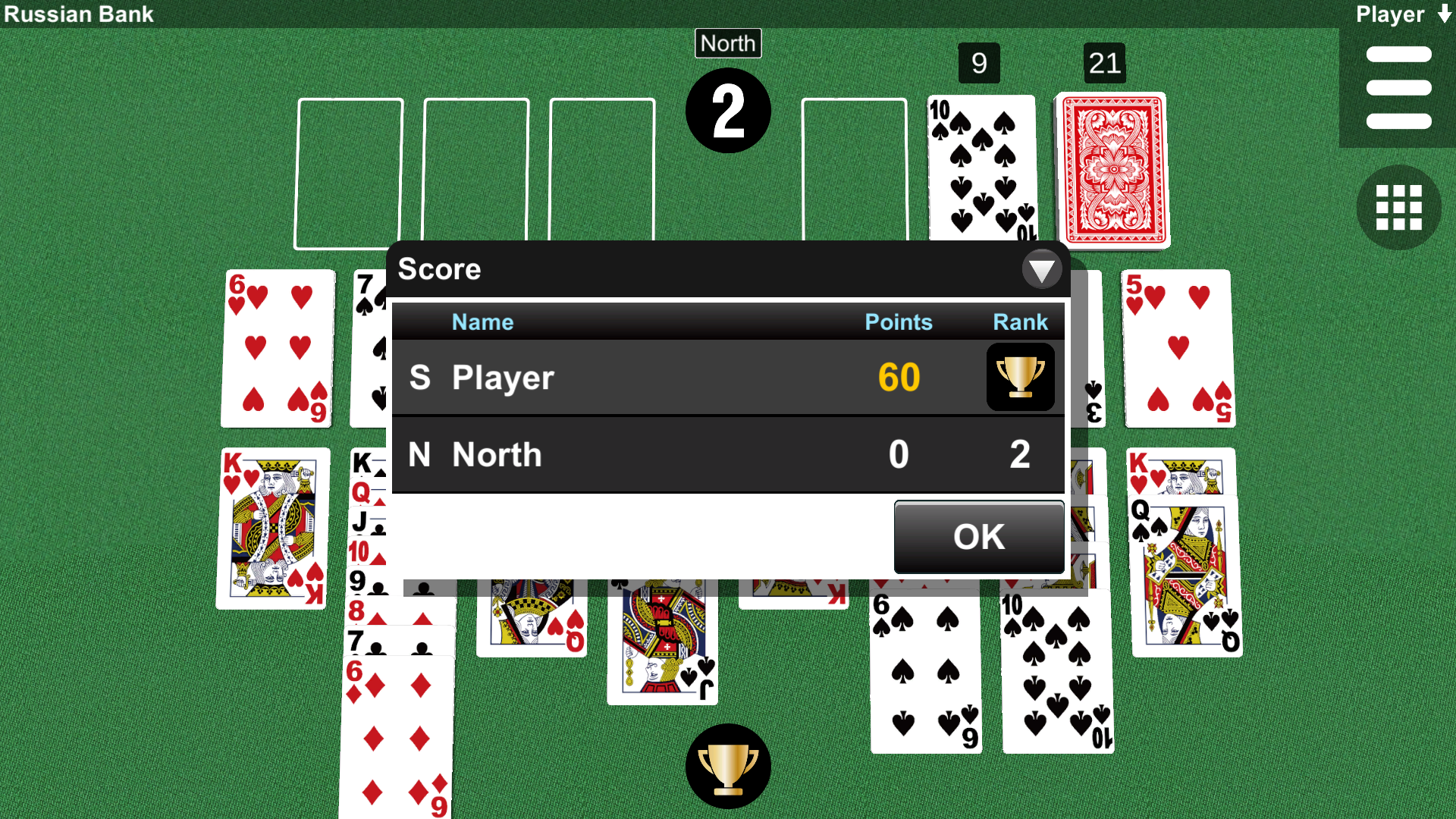 The game ends when one player has no cards left (Fig. 9). Each card in the opponent’s stock or waste pile counts as 1 point, and each card in the reserve counts as 2 points. These points are added to the game points to determine the total score.